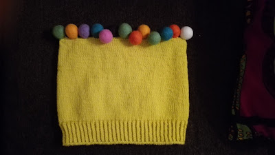 Nuorin valitsi lankakaupasta lempiväristään eli keltaista lankaa pipoa varten. Lisäksi hän valitsi pussillisen huopapalloja pipon koristeeksi. Yksinkertainen neliöpipo, 3 mm pyöröllä ensin pätkä joustinta oikeat kiertäen, sitten sileää. Päälaelle ompelin tytön määräämässä järjestyksessä huopapalloja. Malliksi ei tällä kertaa suostunut kukaan. Lankana Regia Active, jota kului noin 50 g.